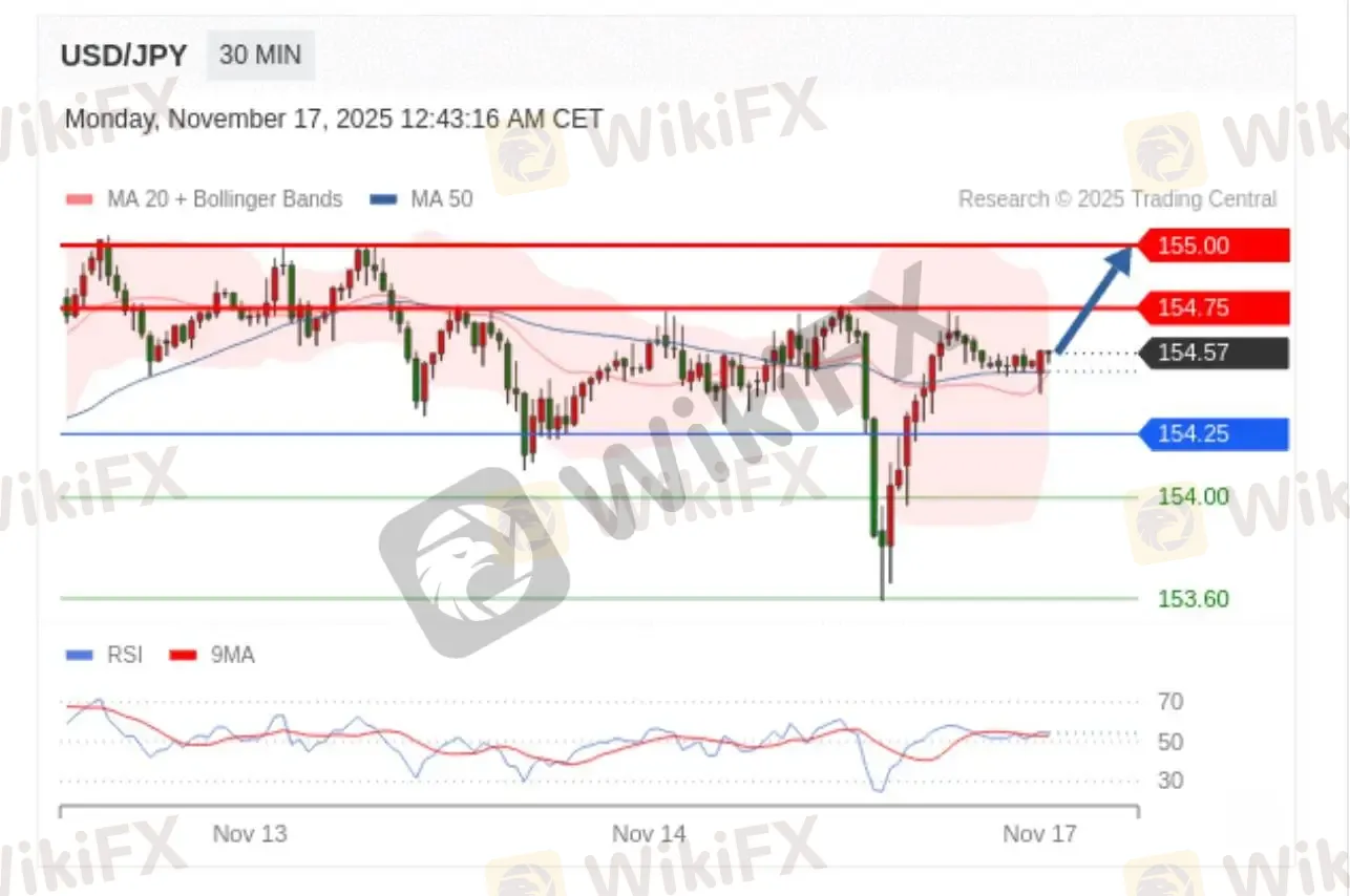 在 154.25 之上,看涨,目标价位为 154.75 ,然后为 155.00 。