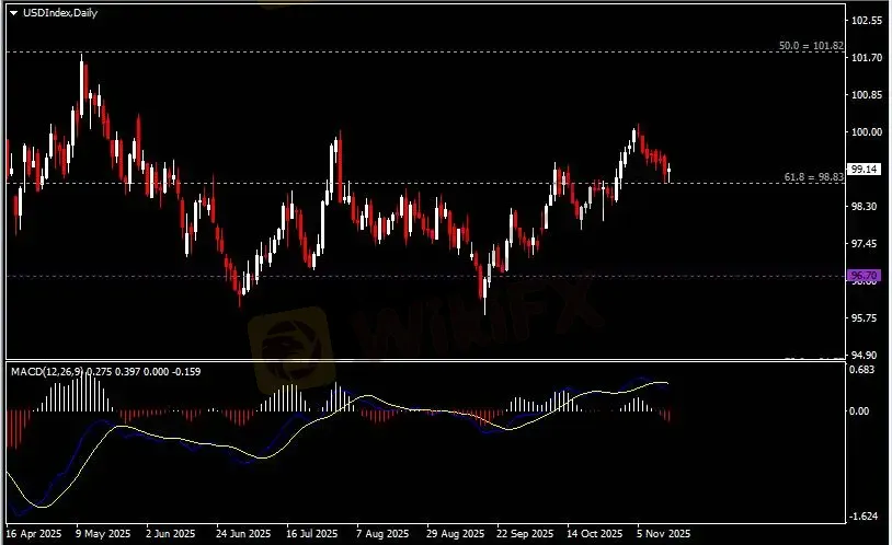日线图显示美元指数小幅反弹,当前收于98.80支撑。从MACD来看,快慢线拐向下行,红色动能柱温和放量。指数走势和动能柱的变化呈分歧。