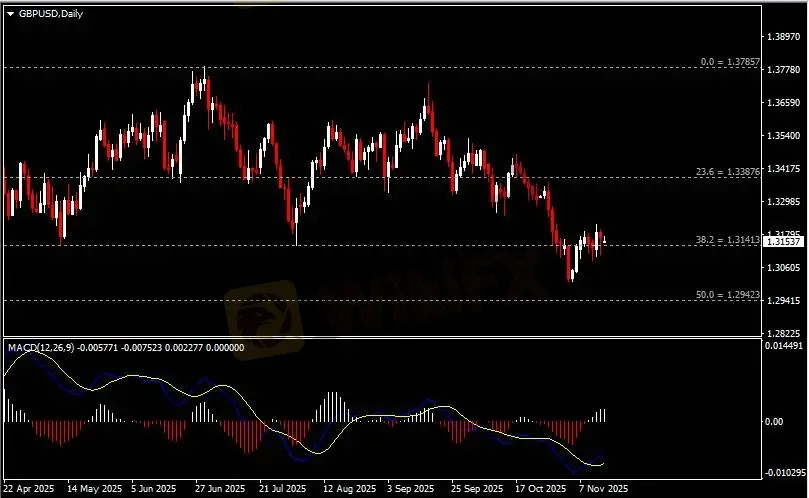 日线图显示英镑兑美元小幅下挫,当前测试1.3140支撑。从MACD来看,快慢线向上运行,白色动能柱则温和收缩。汇价走势基本和动能柱的变化一致。