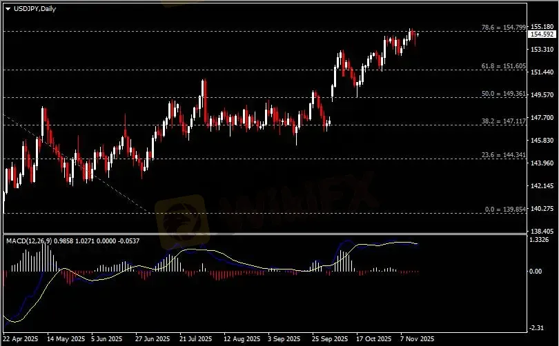 日线图显示美元兑日元涨势暂缓,当前承压于154.80阻力。从MACD来看,快慢线略拐向下行,红色动能柱则呈平行。汇价走势基本和动能柱的变化一致。