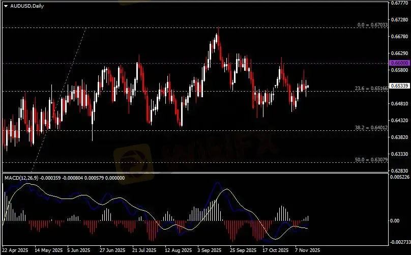 日线图显示澳元兑美元小幅反弹,当前收于0.6520支撑。从MACD来看,快慢线拐向上行,白色动能柱温和放量。汇价走势基本和动能柱的变化一致。
