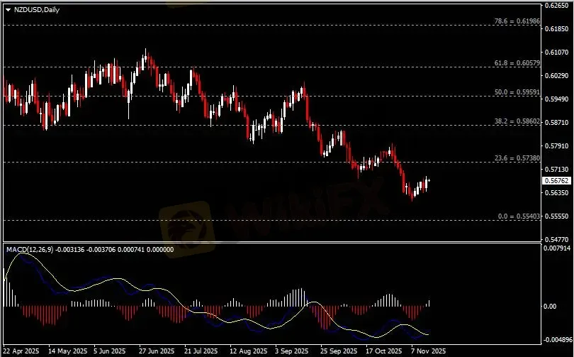 日线图显示纽元兑美元反弹上涨,当前承压于0.5740阻力。从MACD来看,快慢线形成金叉,白色动能柱温和放量。汇价走势基本和动能柱的变化一致。