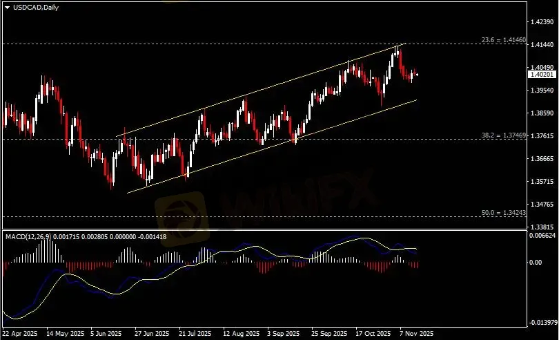 日线图显示美元兑加元小幅回落,当前承压于上行通道顶线。从MACD来看,快慢线拐向下行,红色动能柱温和增量。汇价走势基本和动能柱的变化一致。