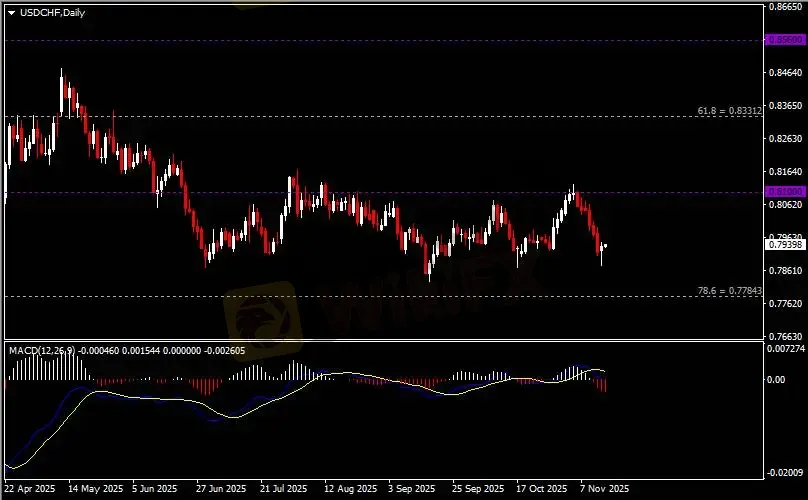 日线图显示美元兑瑞郎触底反弹,当前承压于0.81关键阻力。从MACD来看,快慢线向下运行,红色动能柱温和放量。汇价走势和动能柱的变化呈分歧。