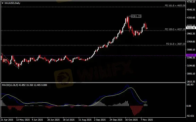 日线图显示金价回调下挫,当前逼近4040支撑。从MACD来看,快慢线呈拐向,白色动能柱温和收缩。金价走势基本和动能柱的变化一致。