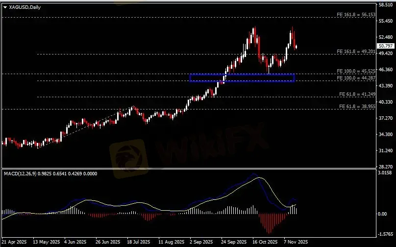 日线图显示银价回调下挫,当前仍收于49关键支撑。从MACD来看,快慢线呈拐向,白色动能柱温和收缩。银价走势基本和动能柱的变化一致。