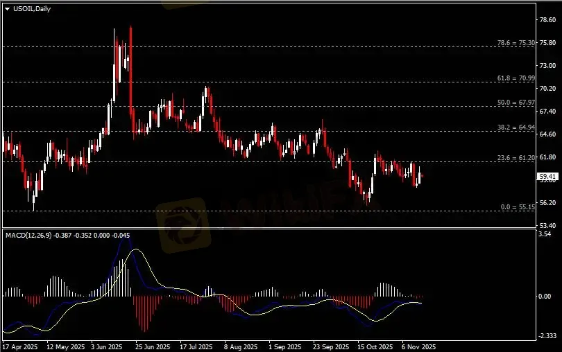 日线图显示油价反弹上行,当前仍承压于61.20阻力。从MACD来看,快慢线逐渐收窄,红色动能柱温和收缩。油价走势基本和动能柱的变化一致。