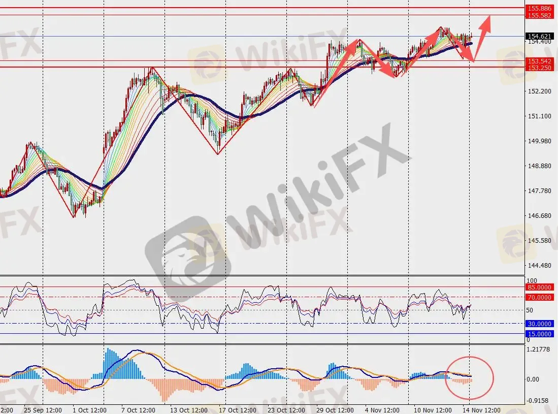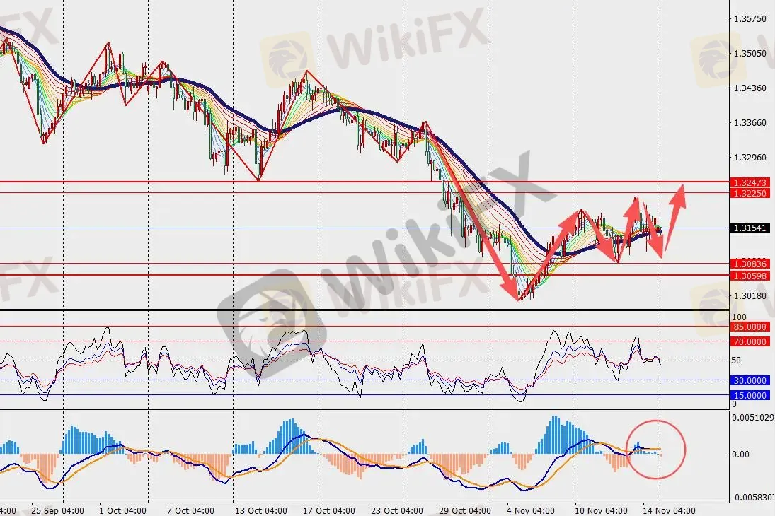 技术面: 欧元兑美元H4级别震荡下行,并在48日多空分界线附近运行。另一方面,MACD双线与量能柱在零轴上方扩张。随着市场接受美国政府重新开放,欧元区10年期国债收益率上涨,德国10年期国债收益率触及五周以来的最高水平。