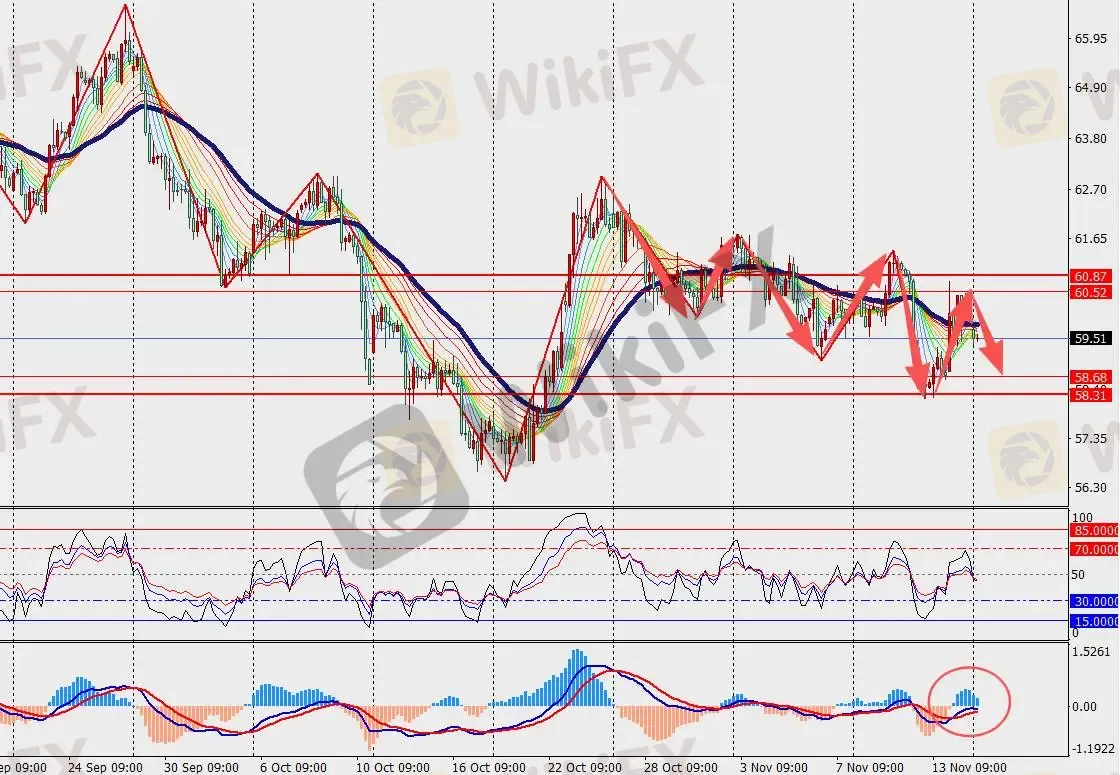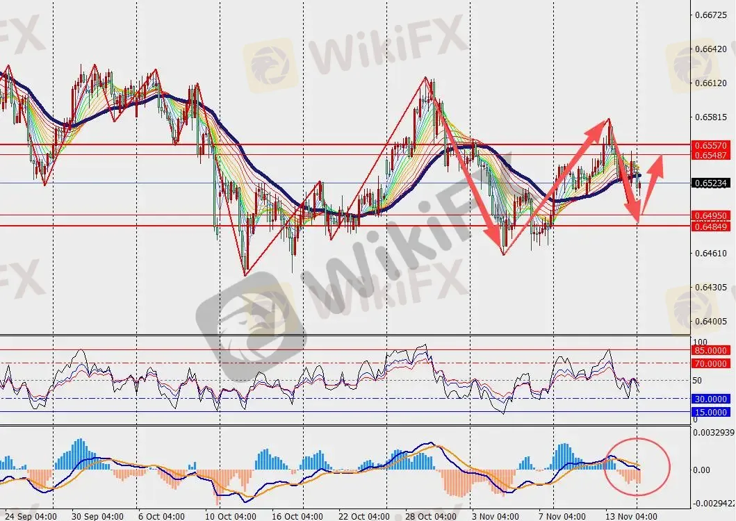 技术面:澳元兑美元H4级别震荡反弹,并在48日多空分界线附近运行。此外,MACD双线和量能柱在零轴上方扩张。本周的风险在于,会议纪要未能充分反映政策会议后的数据变化,投资者可能仍会认为降息的选项未被排除。