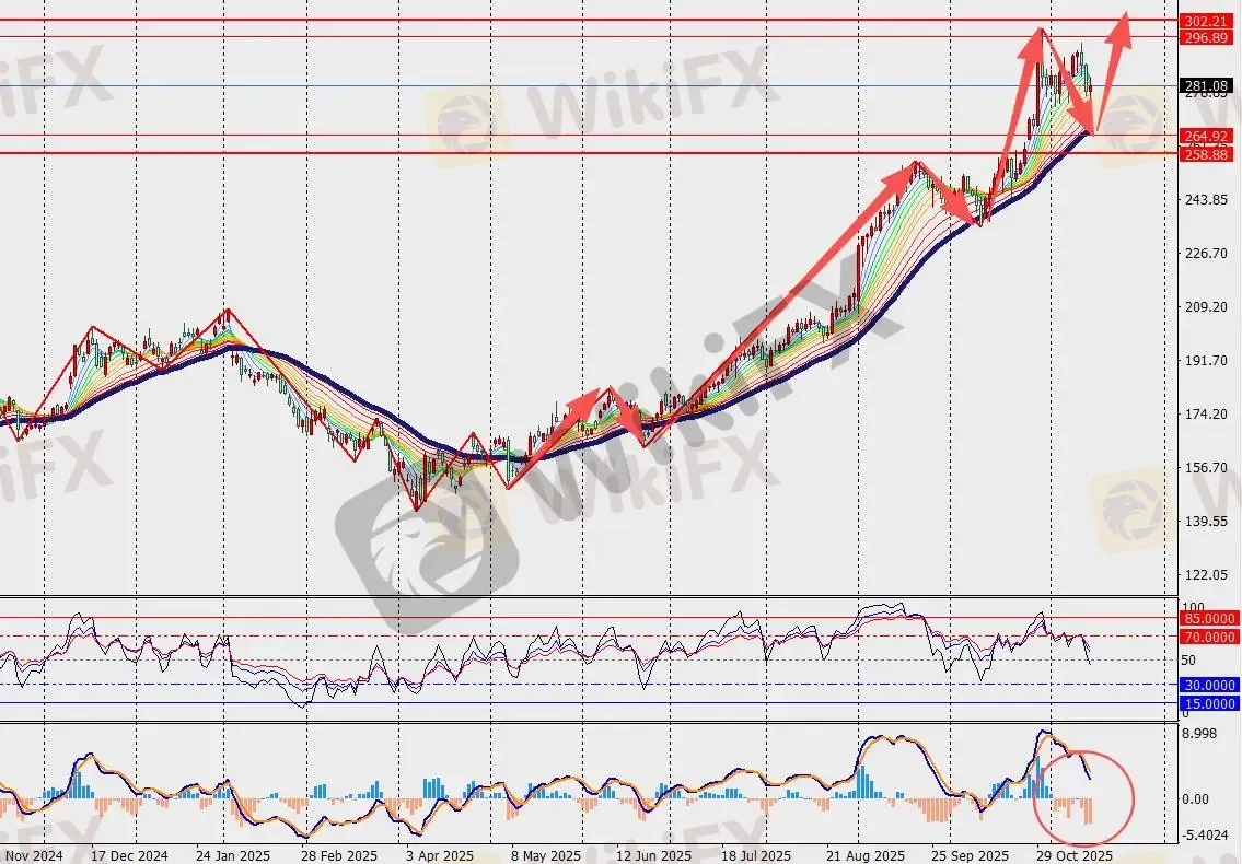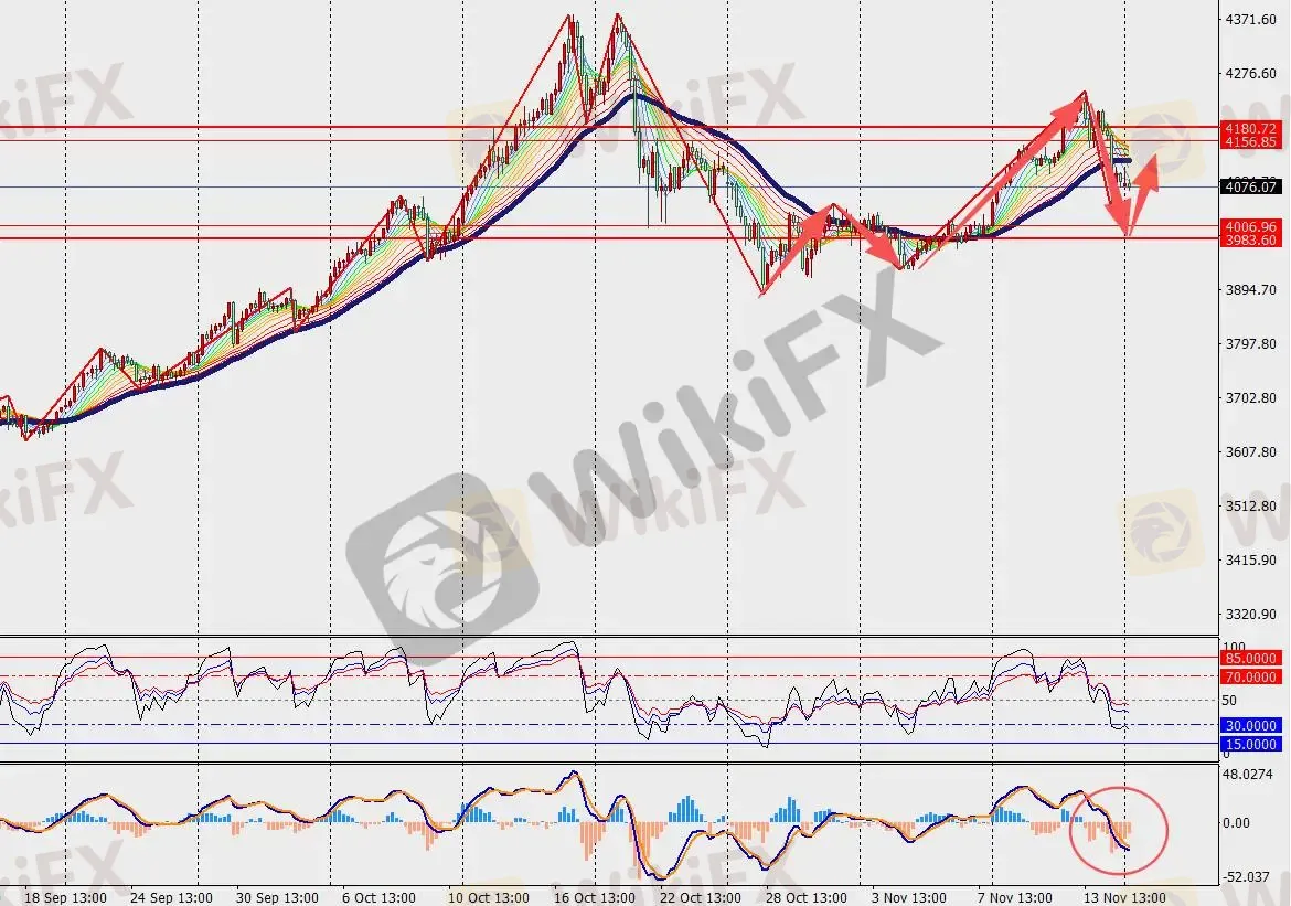 技术面:黄金H4级别高位下跌,并在48日多空分界线下方运行。此外,MACD双线和量能柱开始在零轴下方收敛。若当前趋势延续,不排除金价明年突破5,000美元。尽管牛市逻辑明确,但黄金确实是当前估值较贵的大类资产。