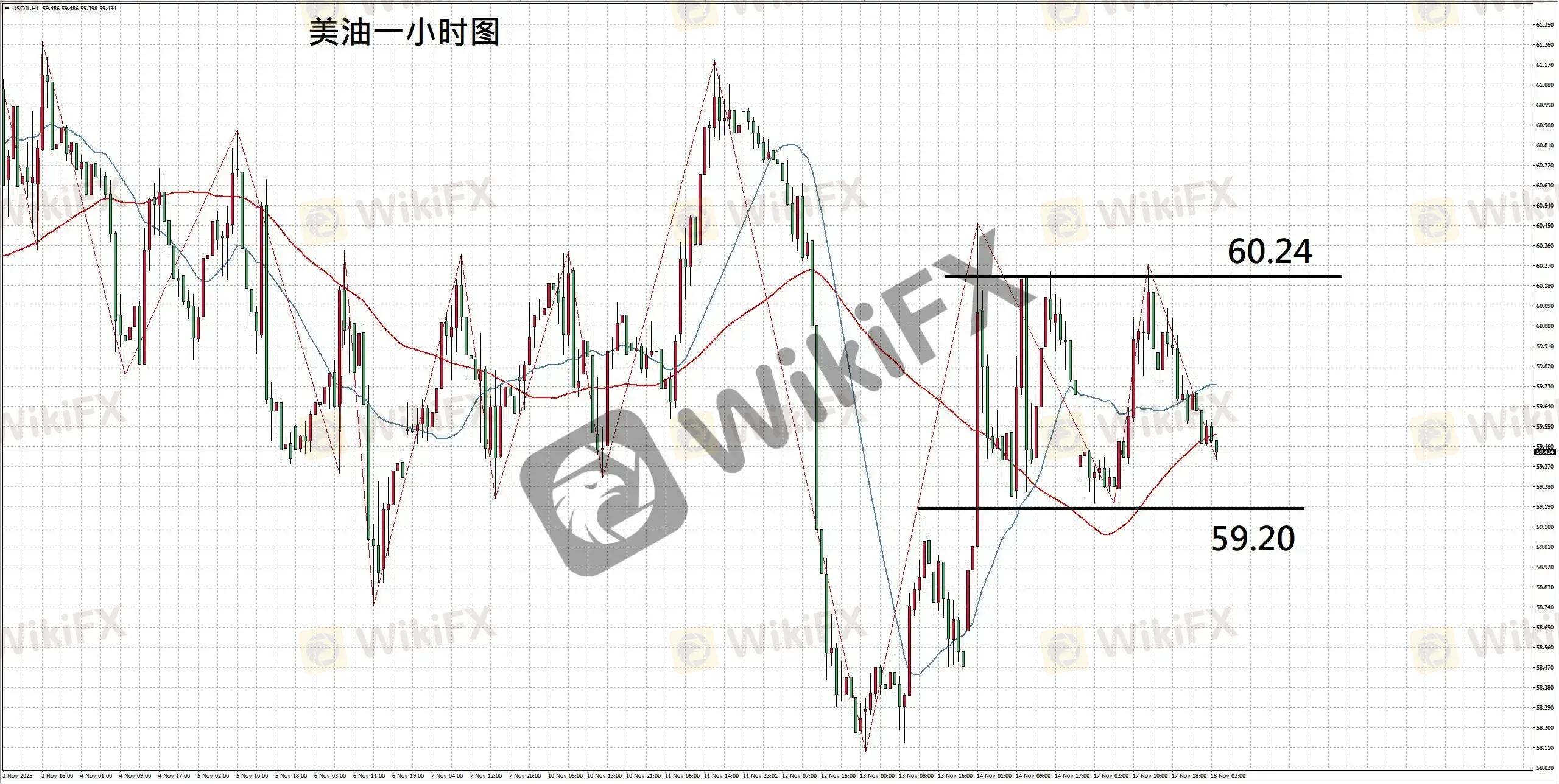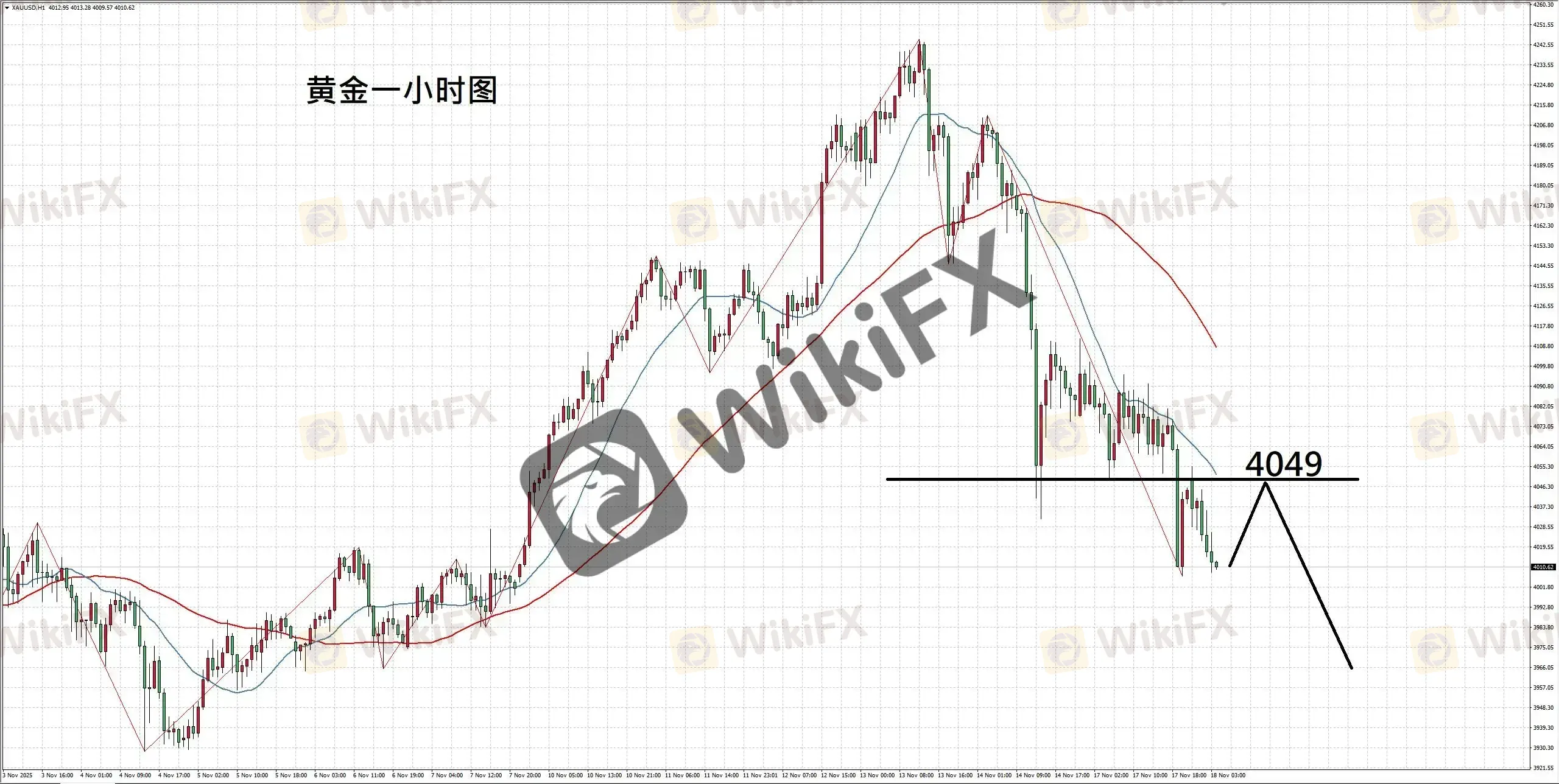 摘要:【基本面分析】昨日美联储副主席杰斐逊强调,未来降息应采取循序渐进的方式;综合近期官员发言,联准会对于12月是否降息显得愈加谨慎。与此同时,美联储传声筒 Nick Timiraos 指出,在缺乏完整经济数据作为指引的情况下,12月会议可能成为分歧最严重的一次。目前利率期货市场对降息的预期已回落至 41%,在鹰派气氛持续升温之下,黄金价格也延续承压回落。【技术分析】黄金一小时图,走势冲高后向下回落,高