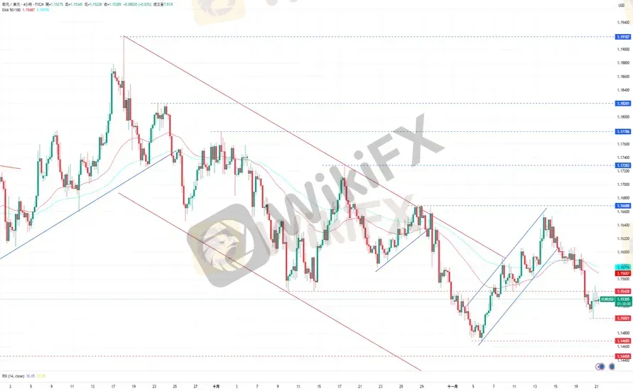 欧元/美元在接触到1.15021水平后反弹走高,以消化RSI指针的超卖讯号。下跌方面,欧元/美元目前的支撑为11月20日的低点1.15021,再来是11月5日的低点1.14685。上涨方面,欧元/美元目前的阻力为EMA50所在的1.15687水平,再来是11月13日的高点1.16560。