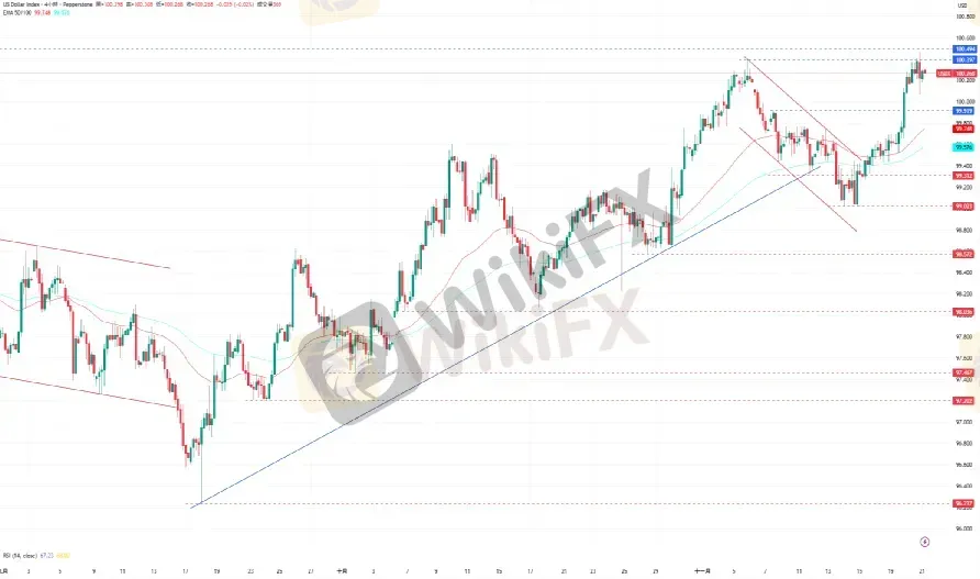 CPT Markets分析师指出,美元指数保持在100.494下方盘整,以消化RSI指针的超买讯号。上涨方面,美元指数目前的阻力为5月29日的高点100.494,再来是5月17日的高点101.234。下跌方面,美元指数目前的支撑为EMA50所在的99.748水平,接着是11月14日的低点99.023。