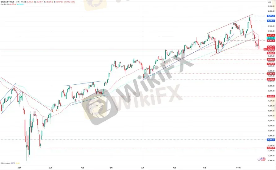 道琼指数在测试了上方的EMA50均线形成的阻力后再度回落。下跌方面,道琼指数目前的支撑为10月20日低点45729点,接着为10月14日低点45452点。上涨方面,道琼指数目前的阻力为EMA50所在的46877点,再来是48000点水平与11月12日的历史高点48431点。