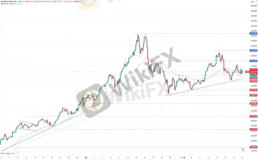 CPT Markets分析师指出,黄金价格受下方上升趋势线的支撑,价格持续在EMA50均线附近震荡。上涨方面,黄金目前的阻力为11月19日的高点4132美元,再来是11月13日高点4245美元。下跌方面,黄金目前的支撑为11月18日的低点3997美元,再来是11月5日的低点3930美元。