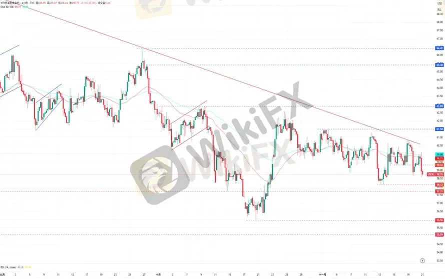 WTI在在测试EMA50均线所在的价格区间后回落,并准备再度测试下方58.12美元的低点。下跌方面,WTI原油目前的支撑为11月13日的低点58.12美元,再来是10月20日的低点55.96美元。上涨方面,若回升至EMA50上方,WTI原油目前的阻力为11月3日的高点61.50美元,再来为10月24日的高点62.59美元。