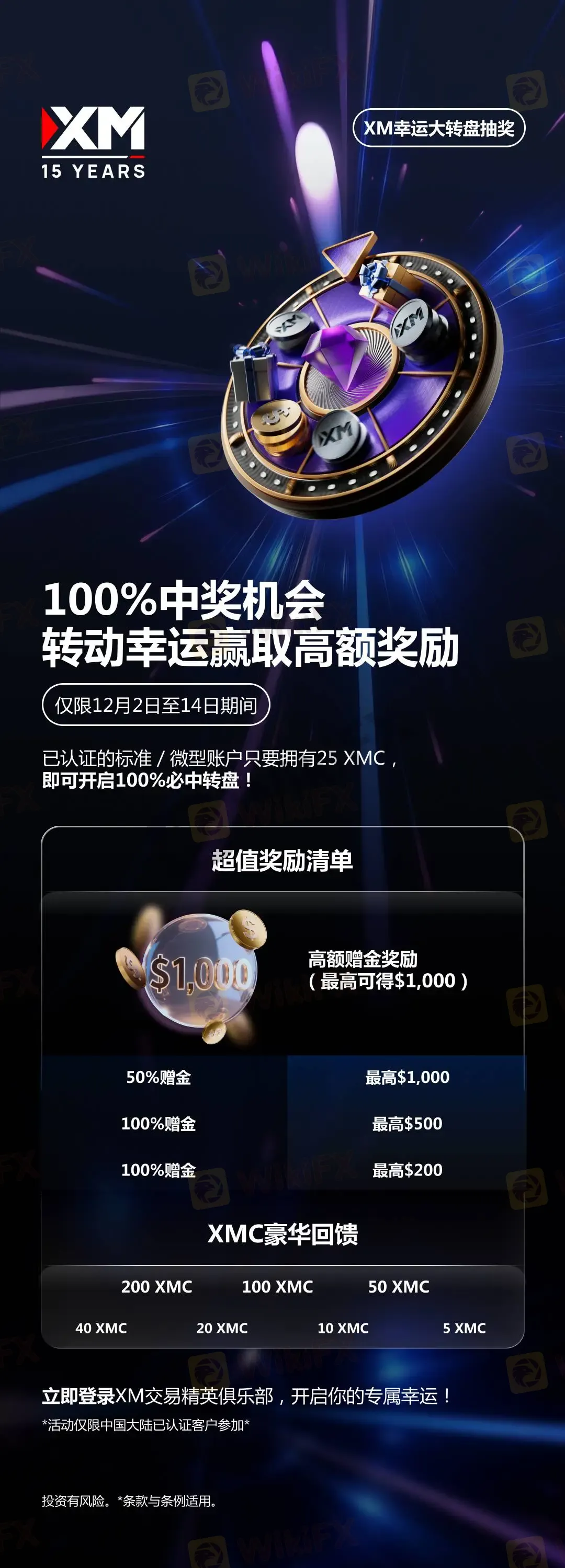 在12月2日至12月14日期间中,只要您是XM 中国大陆已认证的标准或微型账户用户,并且持有25 XM金币(25 XMC),即可转动100%必中的幸运大转盘。