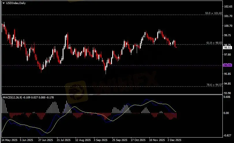 日线图显示美元指数震荡下挫,当前收于前低98.80。从MACD来看,快慢线向下运行,红色动能柱恢复增量。指数走势基本和动能柱的变化一致。