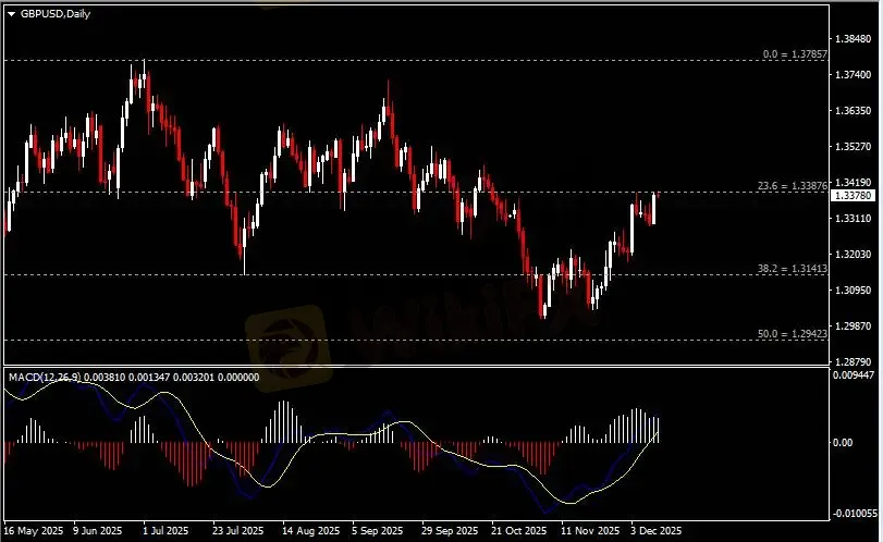 日线图显示英镑兑美元强势冲高,当前测试1.3390阻力。从MACD来看,快慢线向上运行,白色动能柱恢复增量。汇价走势基本和动能柱的变化一致。