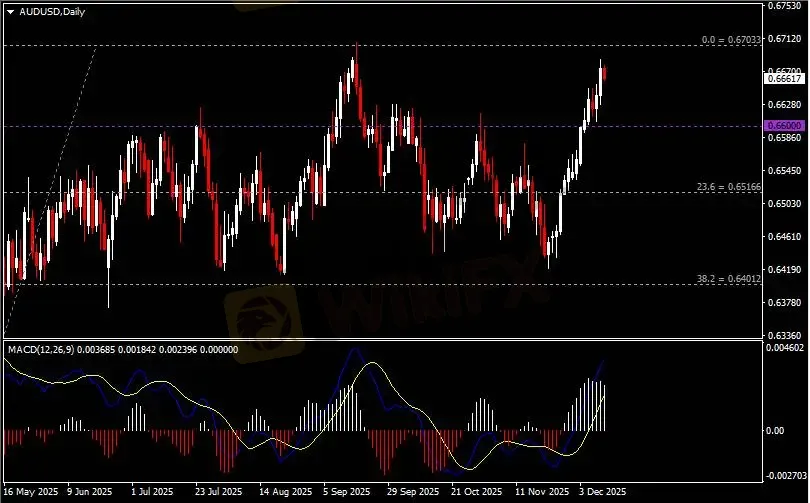 日线图显示澳元兑美元震荡走强,当前企稳于0.66关键支撑。从MACD来看,快慢线向上运行,白色动能柱则温和收缩。汇价走势和动能柱的变化呈分歧。