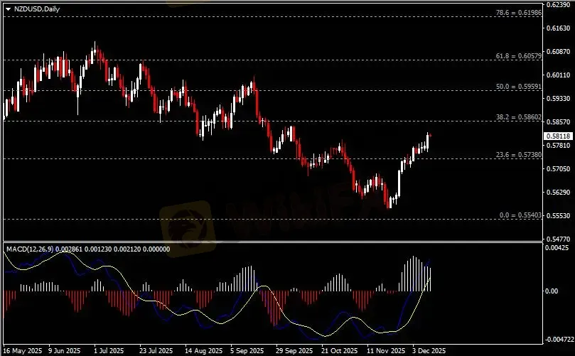 日线图显示纽元兑美元震荡上涨,当前企稳于0.5740支撑。从MACD来看,快慢线向上运行,白色动能柱则温和收缩。汇价走势和动能柱的变化呈分歧。