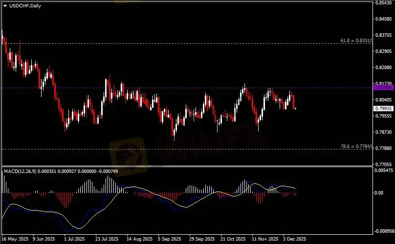日线图显示美元兑瑞郎回调下挫,当前承压于0.81关键阻力。从MACD来看,快慢线拐向下行,红色动能柱温和增量。汇价走势基本和动能柱的变化一致。