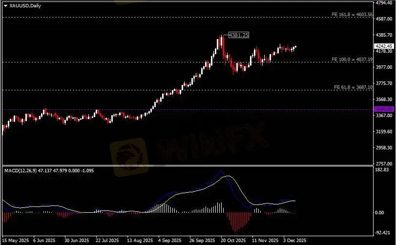 日线图显示金价震荡上行,当前仍企稳于4040支撑。从MACD来看,快慢线死叉依旧,白色动能柱收缩殆尽。金价走势和动能柱的变化呈分歧。