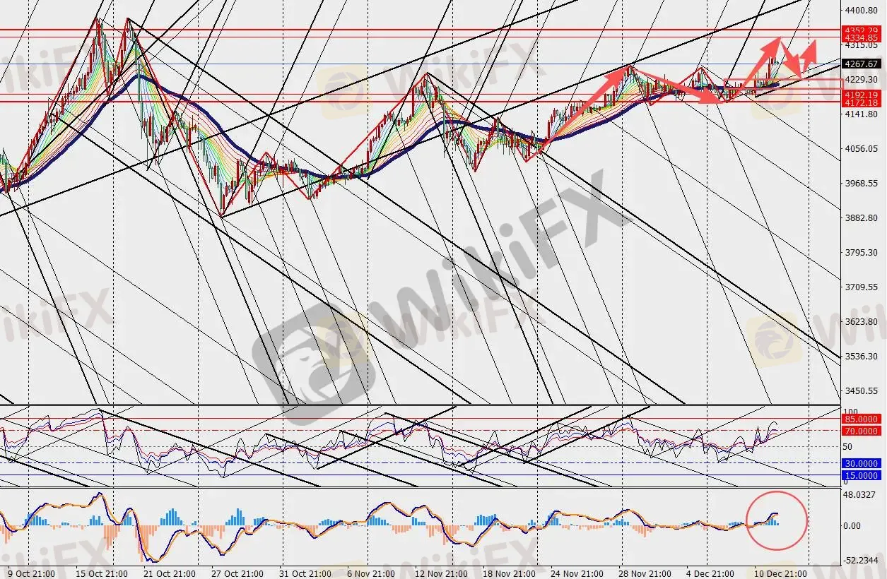 黄金H4级别持续上涨,但MACD双线和量能柱开始构成顶背离缩量。到2026年底,市场预计金价将达到4900美元,但如果多元化资金流动从央行扩展至更广泛的私人投资者,这一预期存在显著的上行不确定性。