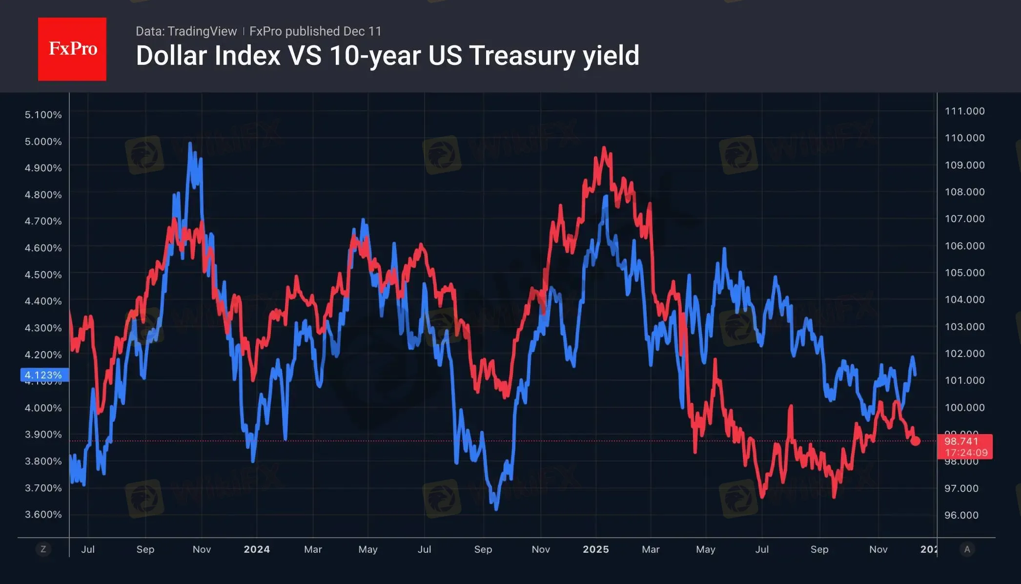 1 月关键利率下调的概率已从 25% 降至 20%,期货市场预计降息最早要到 4 月才会确定。因此,美元此次下跌显得有些过度。另一个影响因素是主要竞争货币的强势表现:欧洲央行(ECB)和澳大利亚储备银行(RBA)官员均未排除最早于 2026 年收紧政策的可能,而日本央行前首席经济学家早川英男(Hideo Hayakawa)则提到,到 2027 年底可能会有四次加息。