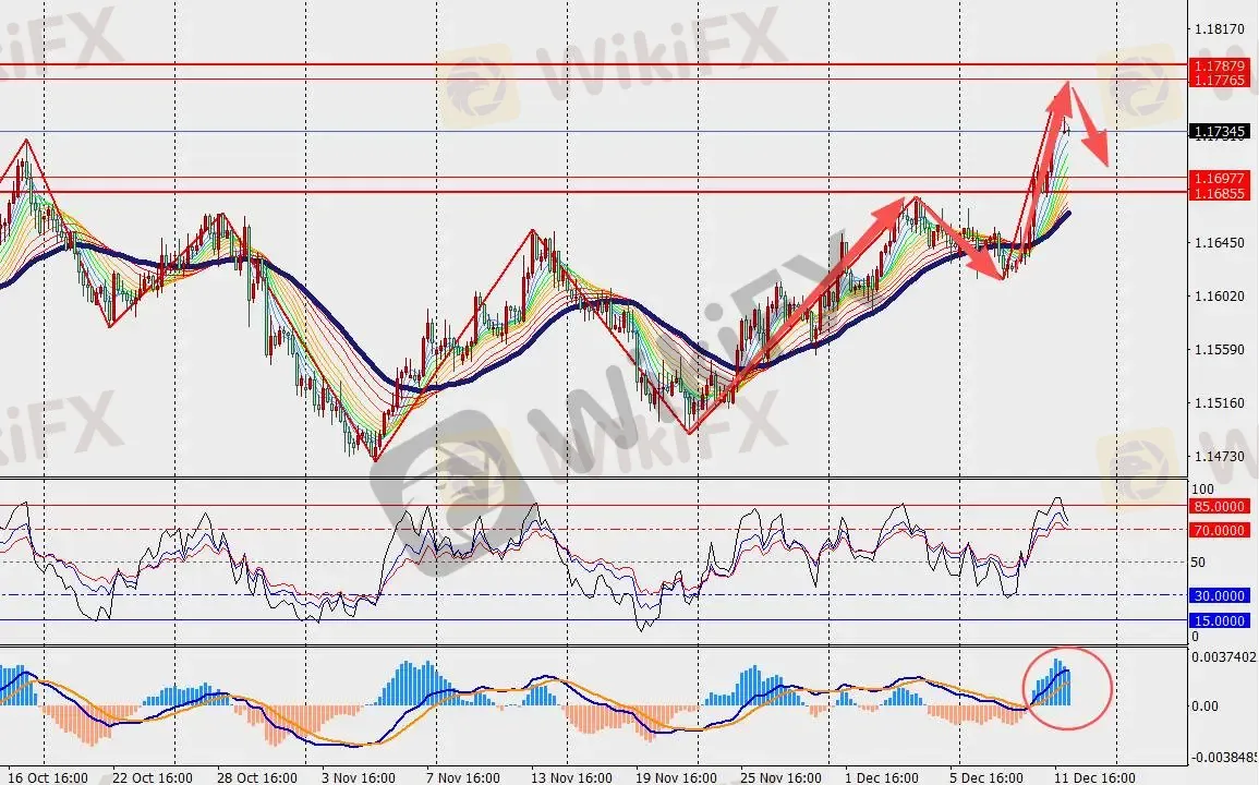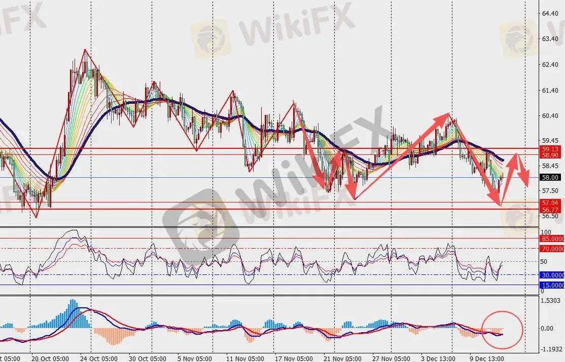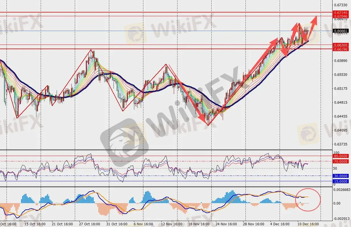 技术面:澳元兑美元H4级别高位盘整,并在48日多空分界线上方运行。另一方面,MACD双线和量能柱在零轴上方扩张。经济疲软、就业市场走弱和高通胀,将使澳洲联储在圣诞假期期间有很多问题需要思考。