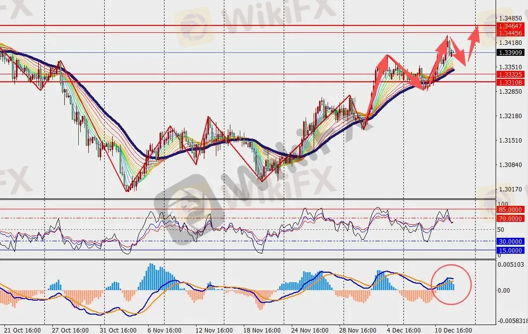第一阻力位:1.3450 第一支撑位:1.3340