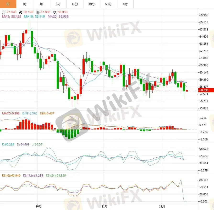 从技术层面来看,WTI 原油的价格走势同样呈现出疲弱格局。经过长达数周的震荡整理之后,油价最终跌破先前维持的 58 至 63 美元区间下沿,使短期趋势由横盘转为偏弱。