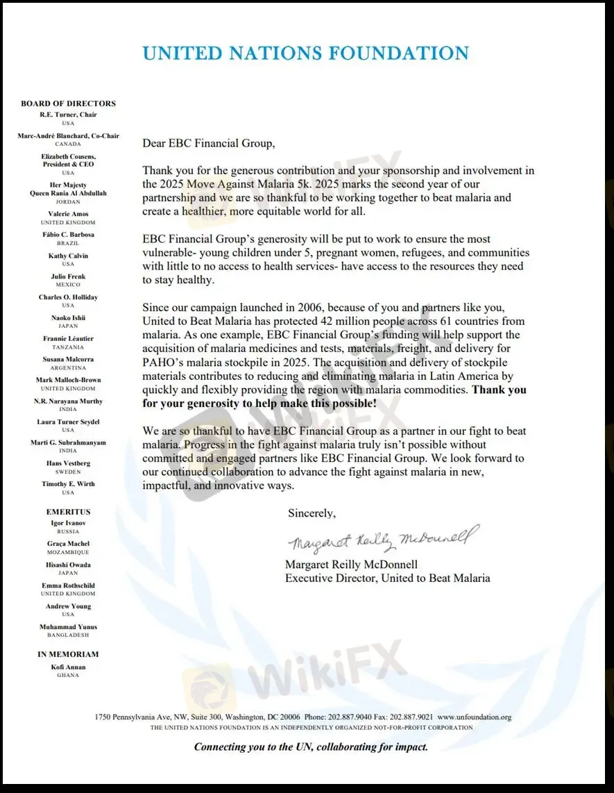 摘要:在世界许多角落,一只携带疟原虫的蚊子叮咬,就可能让一个不到5岁的孩子经历高烧、抽搐,甚至失去稚嫩的生命。疟疾——这个本可预防和治疗的疾病,至今仍是全球儿童健康的头号杀手,威胁着资源匮乏区的孩子们。然而,希望之光正持续汇聚。近日,EBC金融集团再次收到联合国基金会的诚挚感谢信。这封信不仅是对我们2025年“联合打败疟疾5公里跑”活动中慷慨赞助与全球员工踊跃参与的认可,更是对EBC以实际行动守护儿童生