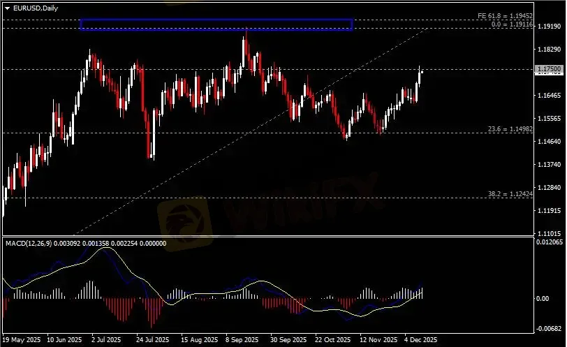 日线图显示欧元兑美元震荡上行,当前测试1.1750阻力。从MACD来看,快慢线向上运行,白色动能柱温和放量。汇价走势基本和动能柱的变化一致。