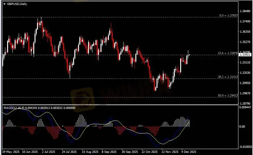 日线图显示英镑兑美元震荡上行,当前持续测试1.3390阻力。从MACD来看,快慢线向上运行,白色动能柱则呈平行。汇价走势和动能柱的变化稍显分歧。