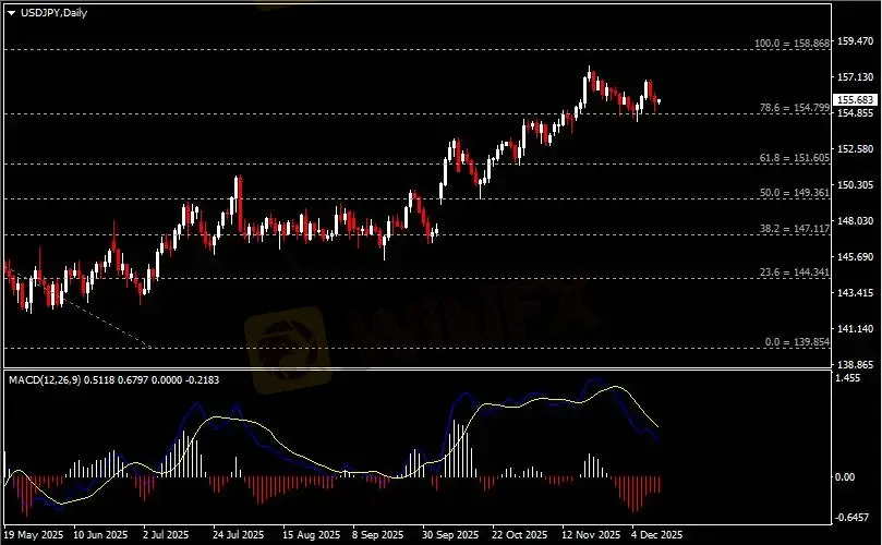 日线图显示美元兑日元回调下挫,当前仍收于154.80支撑。从MACD来看,快慢线向下运行,红色动能柱则呈平行。汇价走势和动能柱的变化呈分歧。