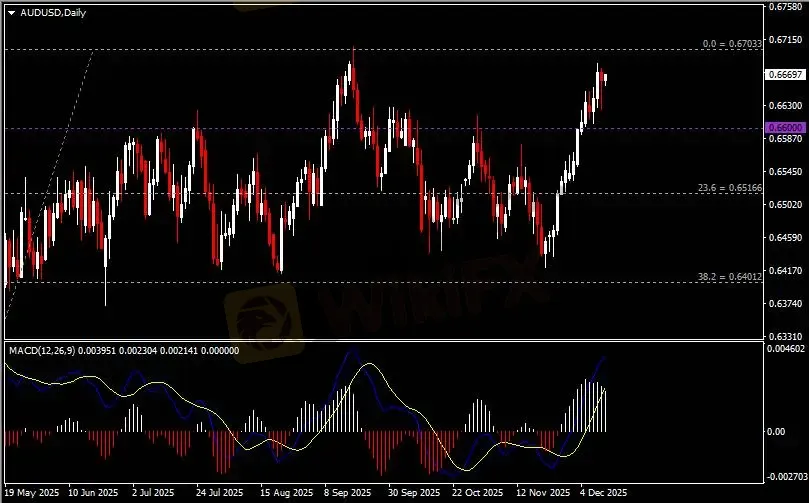 日线图显示澳元兑美元小幅下挫,当前仍企稳于0.66关键支撑。从MACD来看,快慢线向上运行,白色动能柱则温和收缩。汇价走势基本和动能柱的变化一致。