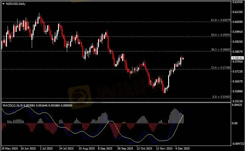 日线图显示纽元兑美元小幅回调,当前仍企稳于0.5740支撑。从MACD来看,快慢线向上运行,白色动能柱则温和收缩。汇价走势基本和动能柱的变化一致。