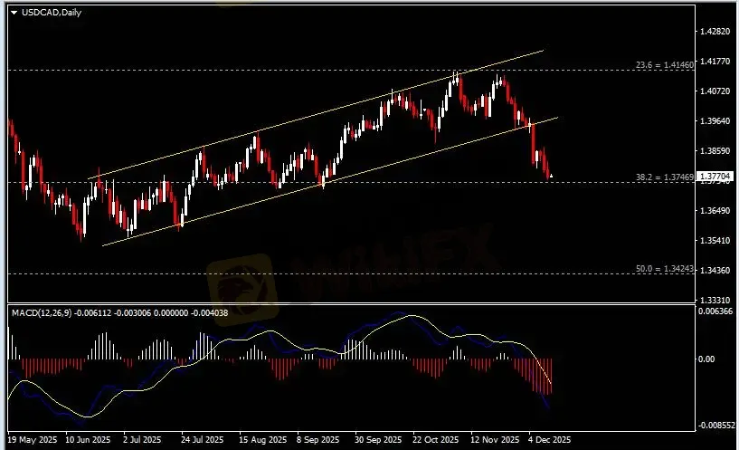 日线图显示美元兑加元震荡走弱,当前逼近1.3750支撑。从MACD来看,快慢线向下运行,红色动能柱则温和收缩。汇价走势和动能柱的变化呈分歧。