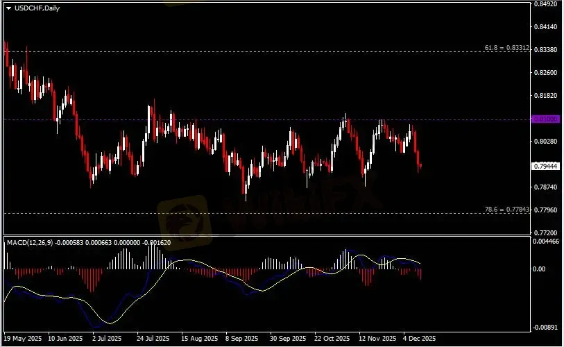 日线图显示美元兑瑞郎持续走弱,当前承压于0.81关键阻力。从MACD来看,快慢线向下运行,红色动能柱温和增量。汇价走势基本和动能柱的变化一致。