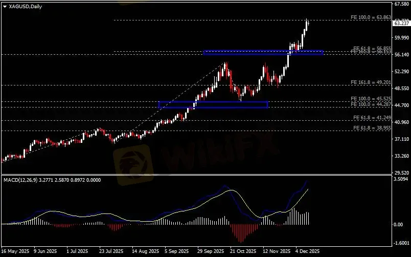 日线图显示银价震荡冲高,当前测试63.90阻力。从MACD来看,快慢线向上运行,白色动能柱则略呈收缩。银价走势和动能柱的变化呈分歧。