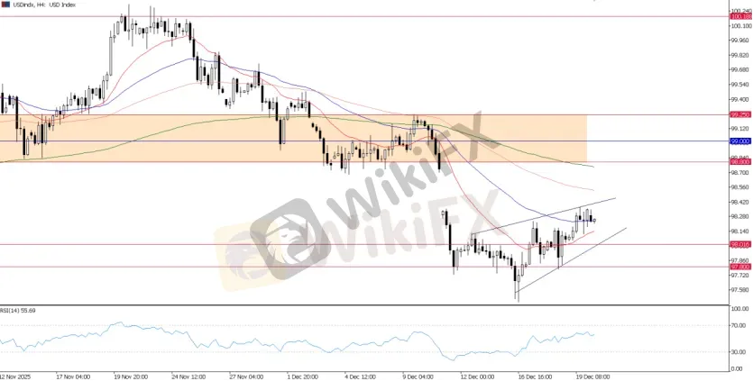 技术面上,美元重返98.00水平,显示短期支撑稳固,在圣诞行情期间可能出现反弹。然而,上行空间有限,因整体看跌结构仍在,且上升楔形形态持续限制涨幅。