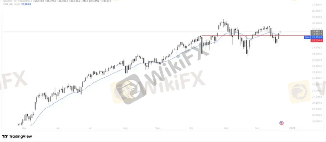 NAS100 日线已重新站稳 20 日均线(EMA20) 并获得有效支撑,显示短期多头重新掌控主动权,回踩后的承接力确认了中期上升结构仍在,指数反弹动能有望延续,短线关注 25,600–25,800 区间的上方压力,若放量突破,行情有机会进一步向 26,000 一线推进。