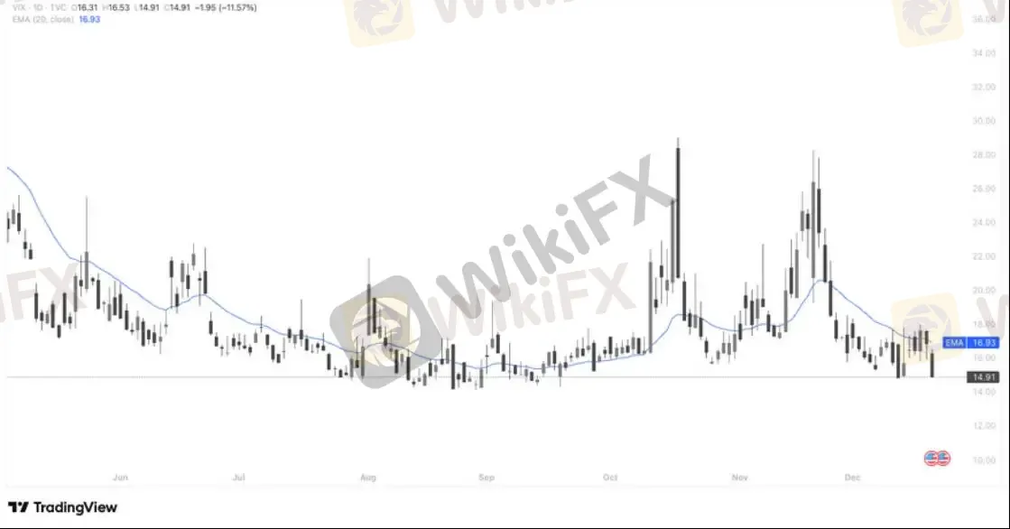 从日线结构看,VIX 明显回落并跌破 20 日均线(约 16.9),波动率中枢下移,显示市场对短期不确定性的定价正在下降,避险需求同步降温;在未重新站回 EMA20 之前,VIX 更可能维持低位震荡或继续走弱,这一结构通常对美股、尤其是科技与成长板块构成正向环境,与 NAS100 站稳均线后的反弹走势形成相互验证。