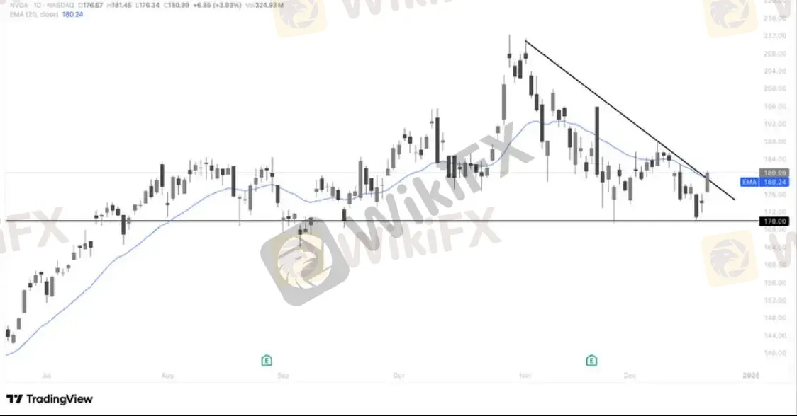 英伟达股价在强劲基本面催化下放量反弹,日线重新站上 20 日均线(约 180),并对前期下降趋势线形成向上突破迹象,短线技术结构由弱转强。