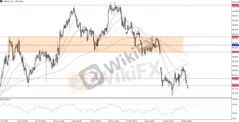 美元指数难以守住98.00关口,近期上升楔形破位,技术面暗示更广泛的看跌延续。