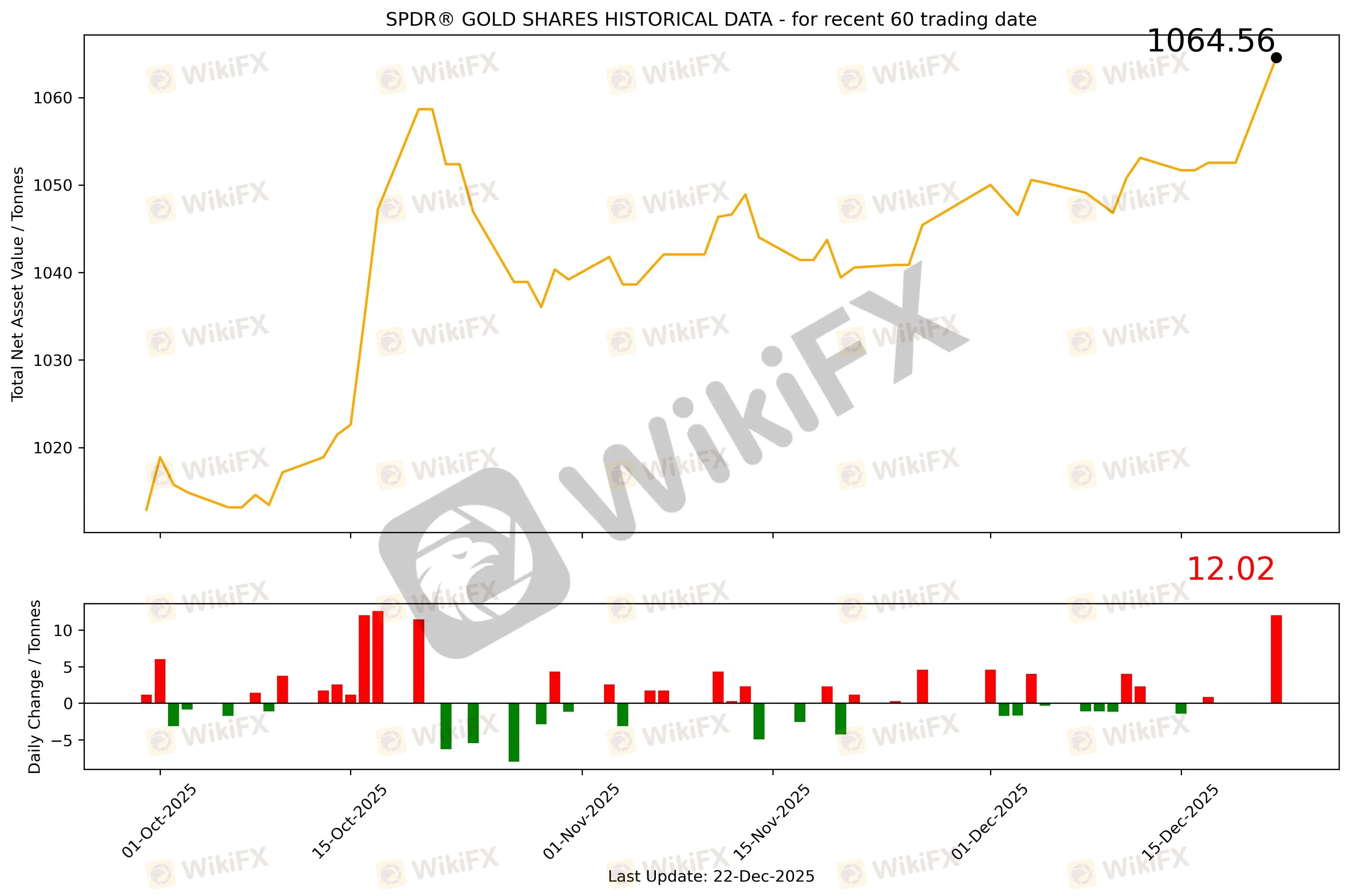 截至12月22日,全球最大的黄金ETF SPDR Gold Trust持仓量为1064.56吨,比上一个交易日增加12.02吨。12月22日现货黄金自4338.36美元/盎司开盘后全天持续走高,最高向上触及4449.16美元/盎司,最终收于4443.96美元/盎司,涨105.291美元或2.43%。