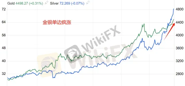 然而,黄金和白银在相对清淡的圣诞周,走出了一轮震惊市场的疯涨走势。本周前三个交易日,黄金从开盘价4339美元涨至今日盘中最高4525美元,累计涨幅4.3%;白银从开盘价67.26涨至今日盘中最高价72.68美元,累计涨幅8.1%。