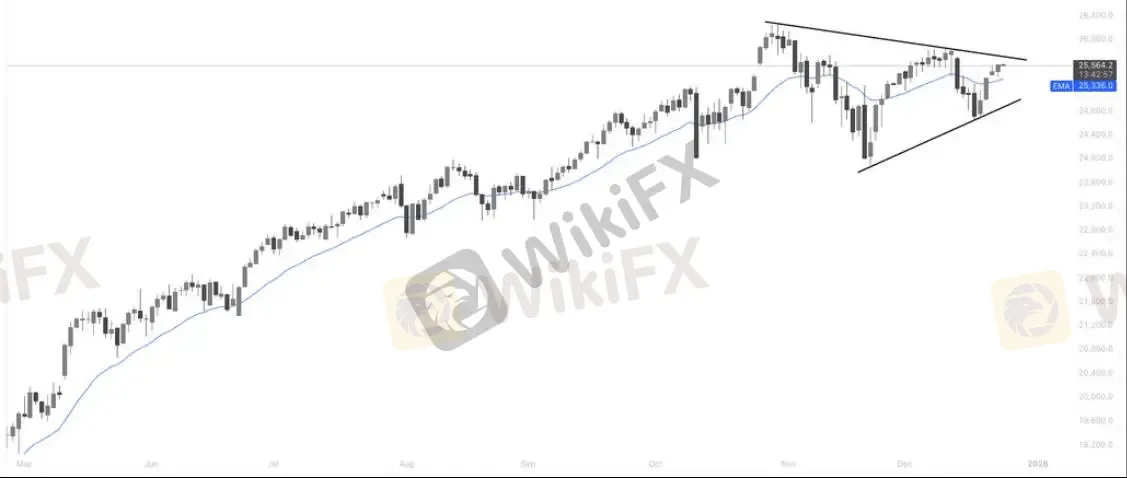 从日线结构看,NASDAQ 100 在前期强势上行后进入高位收敛区间,价格沿着下降上轨与抬升下轨运行,形成偏强的整理形态。当前指数仍稳守短期 EMA 之上,回落过程量能收敛,显示抛压有限、以消化获利盘为主;只要不有效跌破下轨与均线支撑,整体仍属多头趋势中的整理。策略上更适合跟随整理后的突破方向交易:向上突破上轨将重启趋势、打开新高空间;若跌破下轨与EMA,则需防范阶段性回调加深。
