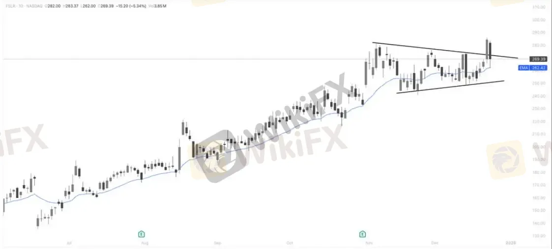 First Solar 昨日回落主要属于高位整理过程中的技术性修正,价格在下探过程中仍稳守上升通道下轨与日线EMA支撑,关键结构并未被破坏。从趋势角度看,中期均线持续向上、低点逐步抬高,说明资金并未出现趋势性撤离,更像是在前期快速上涨后的获利消化。只要后续不有效跌破通道下沿与均线支撑,整体仍维持多头结构,策略上以持有观察、等待整理后方向选择为主;若量能配合重新向上突破通道上轨,则有望恢复趋势行情。